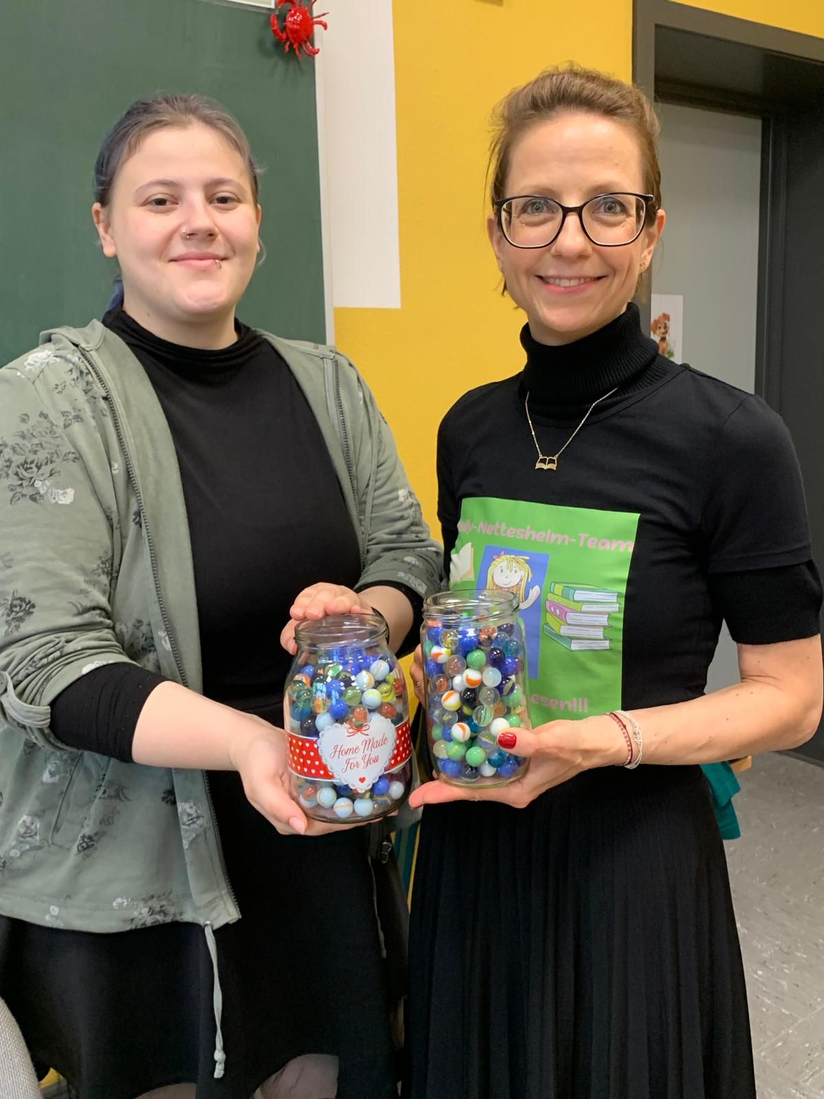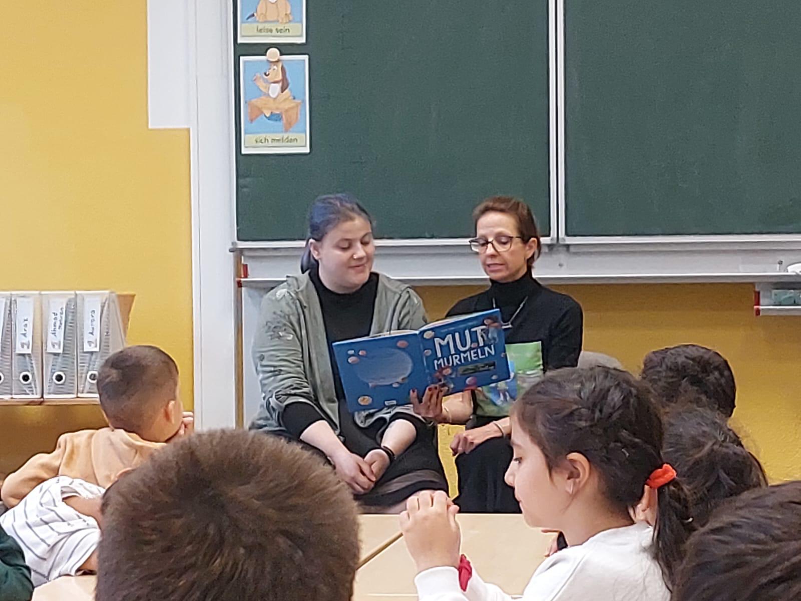 Die ersten aufregenden Schultage für unsere Giraffen- und Hundekinder sind bereits gut geschafft. Trotzdem freuen sich alle über den Besuch der beiden Mitarbeiterinnen der Buchhandlung Nettesheim in Cronenberg. Denn das Buch "Mutmurmeln für den ersten Schultag", das sie den Kindern auf so mitreißende Art vorlesen, schenkt auch am 10. Schultag noch mächtig viel Mut. Daran soll sie auch die Murmel erinnern, die alle Kinder im Anschluss bekommen. Aber das war noch nicht alles: Kaum sind alle Murmeln verteilt, kommen noch die Paten aus den vierten Klassen vorbei und überreichen ihren Patenkindern Geschenktütchen. Schon am Ende des letzten Schuljahres hatten die Kinder die Dekoration für diese von der Buchhandlung befüllten Tütchen mit viel Hingabe gebastelt. Und das Buch, das sich im Tütchen befindet, soll nun zum Vorlesen und Lesen anregen. Organisiert und finanziert hat diese tolle und sehr gelungene Aktion unser Schulverein.