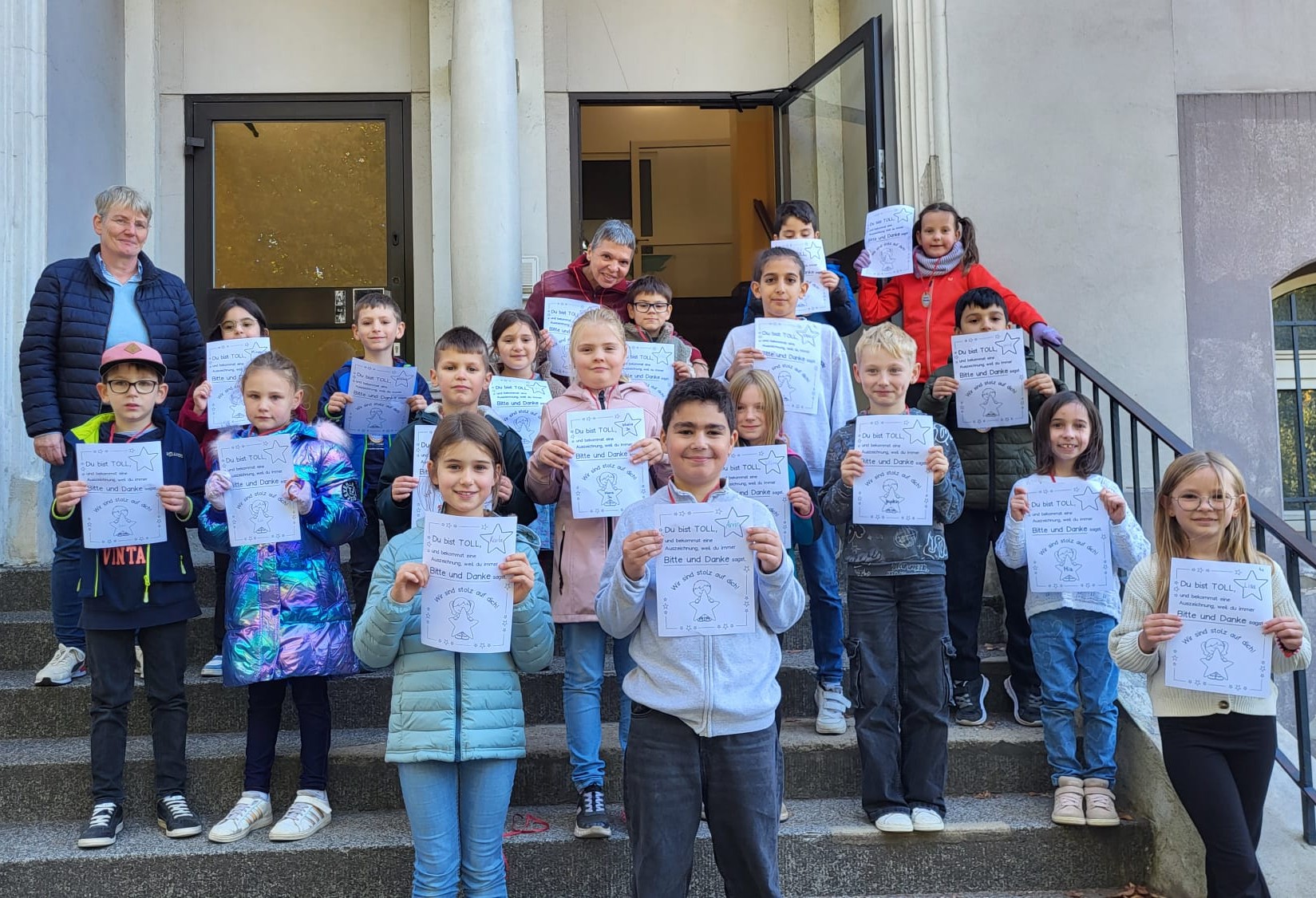 Was sind denn Sternchenkinder? In regelmäßigen Abständen wählt jede Klasse ein Mädchen und einen Jungen, die etwas besonders gut können. Im ersten Quartal des Schuljahrs 2025/2026 war das Motto für unsere Sternchenkinder-Wahl "Ich sage BITTE und DANKE". Für die Hunde und Giraffen war es die erste Gelegenheit ein Mädchen und einen Jungen ihrer Klasse zu wählen, die sich besonders freundlich verhalten und besonders oft BITTE und DANKE sagen. Die anderen Klassen waren schon geübt im Beobachten ihrer Mitschülerinnen und Mitschüler und auch darin, selbst besonders darauf zu achten diese "Zauberwörter" zu nutzen. Ein besonderes Highlight und eine Überraschung war bei dieser Wahl, dass Frau Becker alle Klassen auch nach einer erwachsenen Person gefragt hat, die besonders häufig BITTE und DANKE sagt - und das war Frau Bourlakou!