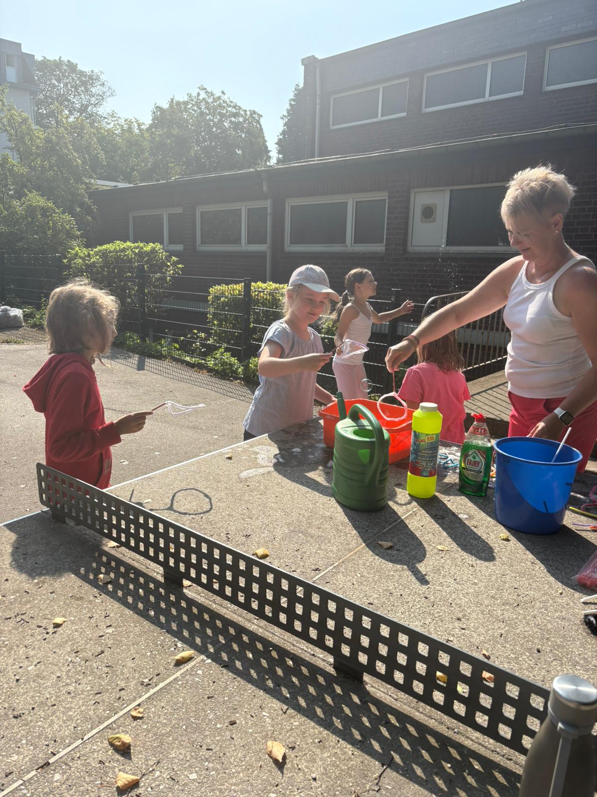In den Sommerferien 2025 fand wie immer ein abwechslungsreiches Programm für unsere Kinder statt: Es wurde Dekoration für den Eingangsbereich gebastelt, Georg kam zum Trommeln zu uns, wir waren Eis essen und haben Seifenblasen gemacht. Ein besonderes Highlight war unsere Poolparty mit Smoothie und Musik. Aber auch bei der Schnitzeljagd hatten wir viel Spaß. Und natürlich waren wir auch in unserem Kleingarten zum Gärtnern und Grillen.